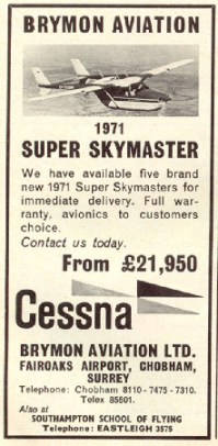- One sixth page advert from Brymon Aviation offering for sale 5 brand new Skymasters for �21,950 each. Taken from Flight International December 1971 and contains a picture of a 337 carrying the false registration D-ELBH. All German 337's are either D-G or D-I.
