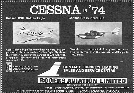 - Half page advert for Rogers Aviation Ltd showing a small picture of an unmarked Pressurized 337 (107k)